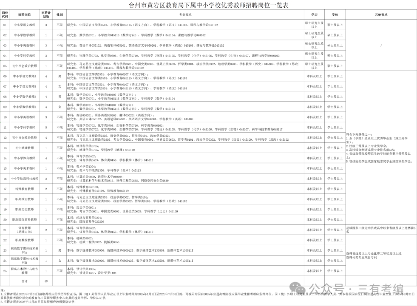 本次公开招聘全额拨款事业编制中小学教师58名。具体招聘岗位、人数、报考资格条件及其他要求详见附件1《台州市黄岩区教育局下属中小学校优秀教师招聘岗位一览表》(以下简称《岗位一览表》)。招聘信息发布如下: