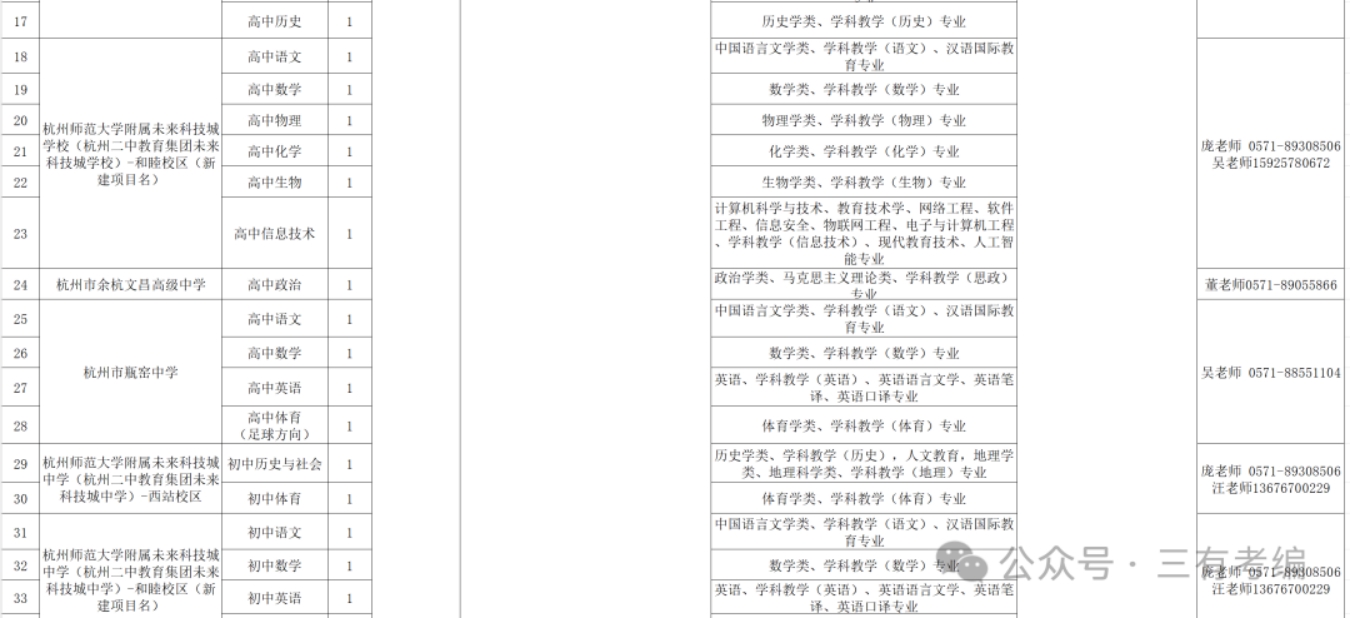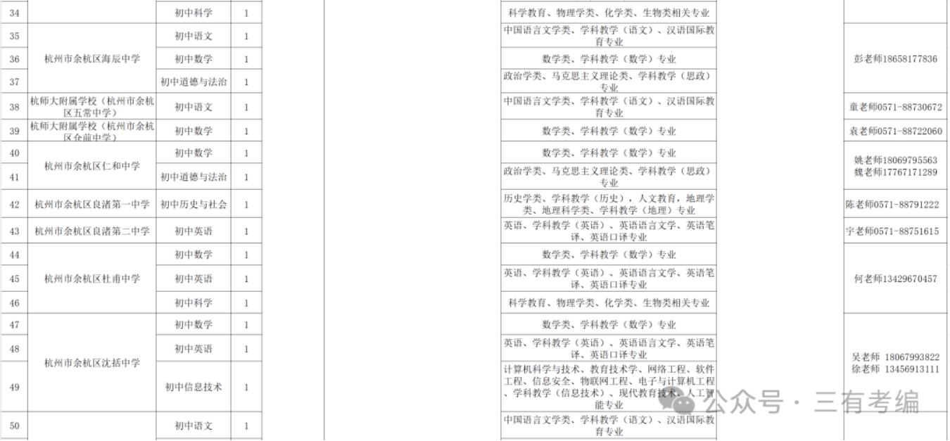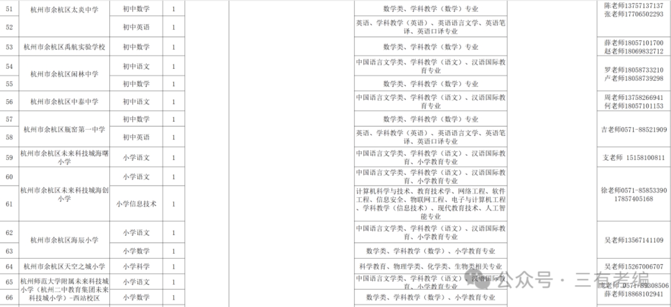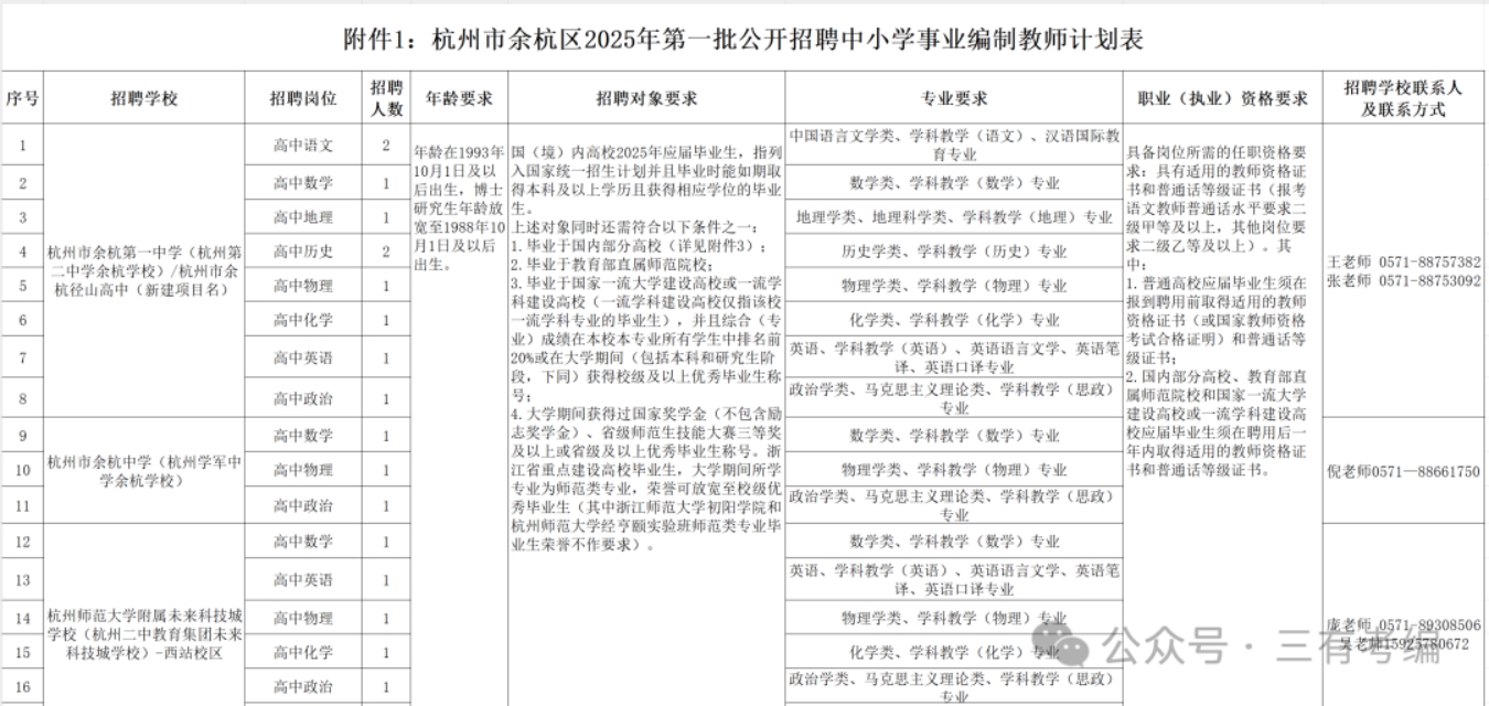 具体详见《杭州市余杭区2025年第一批公开招聘中小学事业编制教师计划表》(附件1)。专业条件参考国家教育行政部门颁布的普通高校专业目录。