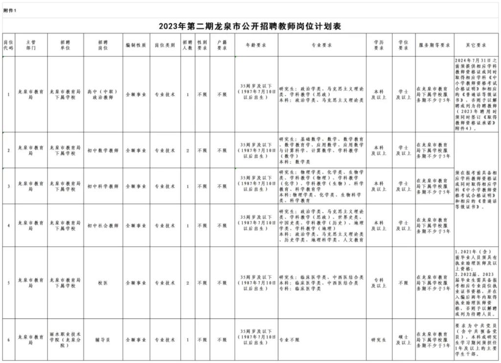附件1.2023年第二期龙泉市公开招聘教师岗位计划表