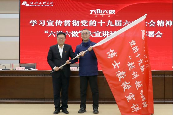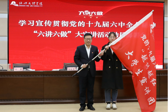 会上,汪俊昌为“越讲越响”博士教授宣讲团、“越讲越红”大学生宣讲团授旗,伟德官网班瑞钧教授、王玉瑶同学作为代表出席。