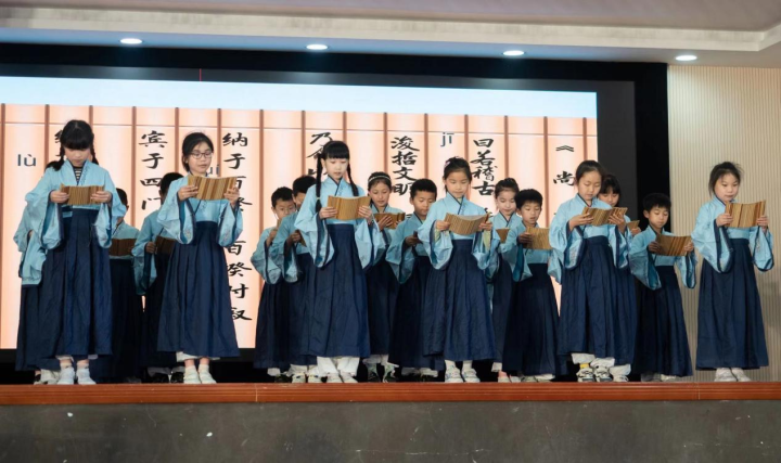 虞舜精神作为中华优秀传统文化,其传承脉络源远流长。早在两千年多年前的春秋时期,孔子所编《尚书》中就专设《舜典》篇章。西汉时期,司马迁在《史记·五帝本纪》中记载了舜的德行,并且认为“天下明德皆自虞帝始”。南宋时期,王十朋在绍兴府佥判任上深入民间考察风土人情,写下了《会稽风俗赋》,记述了舜德精神如何熏陶着千年前的绍兴人。到了现代,毛泽东在《七律·送瘟神》中将人民群众比作尧舜,发出了“春风杨柳万千条,六亿神州尽舜尧”的赞叹。结合以上典籍,大学生们创设4个教学场景,带领中小学生“穿越时空”,通过经典诵读、情景演绎、诗歌传唱等方式跨时空对话四位作者的教学形式,大中小学生共同研学,“大手拉小手”一起感悟历代对虞舜精神的歌颂与传承。